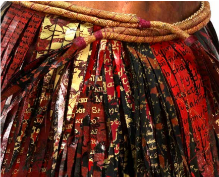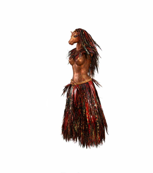 As an environmentally-aware artist, my artwork is made with feathers created from recycled plastic and screen-printed with images of endangered birds. From a distance, these feathers look like textiles, paper, or even a horsehair mane. Dressing ‘Phoenix’ with a breastplate and skirt of feathers gives her both Egyptian and Greek references.
